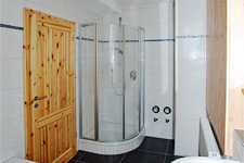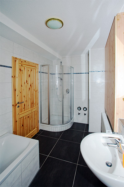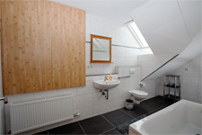 Das helle Bad mit seinem Dachfenster und den weiß gefliesten Wänden ist großzügig ausgelegt und bietet alles, um sich nach einem erfolgreichen Ausflugstag frisch zu machen für einen entspannenden Abend.